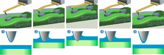Main stages of the measurement cycle in the HD mode for the idealized displacements of the probe are shown in Fig. 2. At large distances between the probe and the sample, deflection of the cantilever remains constant, being at the base level (point 1 of the deflection profile); with further approach, the cantilever bends downward under effects of capillary adhesive forces (point 2). On further approach, when the repulsive tip-sample forces dominate, the bending reverses upwards until it reaches the set-point level (point 3) chosen for lateral scanning feedback. This is the turnaround Z-position of the cycle. As the sample and the tip depart, the probe might experience strong adhesive interactions reflected by a well (point 4) in the deflection, before the probe fully detaches from the sample and the cantilever restores its baselinedeflection (point 5).