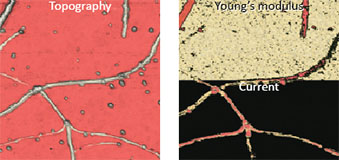Electrical characterization of objects, that are weakly attached to the surface, has always been a challenge when using standard AFM modes like Conductive AFM. This was because often the tip moved or abraded the objects of interest. HybriD Mode drastically decreased the impact of lateral forces and simplified these experiments.Comparison of conductive and mechanical maps shown in this example allows the clear identification of single nanotubes and bundles.