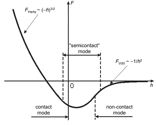 "Joining" potentials of forces acting at various tip-sample separations one can construct the curve shown in Fig. 1 that allows to classify operation modes of an atomic force microscope.