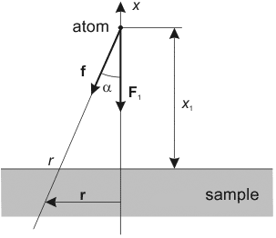 Basing on this microscopic description we can determine the attraction force between the probe and the whole sample. It is equal to the sum of all pairwise interactions between cantilever molecules and the studied surface: