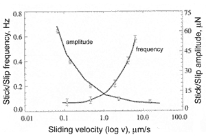 In microtribology, the phenomenon such as "stick-slip" motion is frequently observed. The frictional force between the two sliding surfaces is irregular and is of saw-tooth character (Fig. 4). If a hill of one surface is stuck to a "site" of the other surface via adhesion and capillary forces, it will hardly be unstuck without predominant force. Once it is separated, it jumps (slips) into another "site" where sticks for a while and so on.