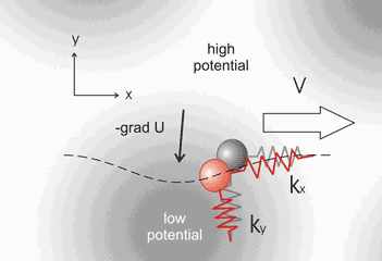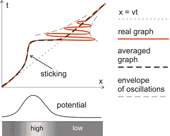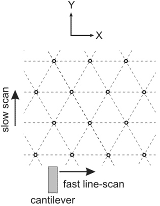 In Fig. 3 dots show a possible trajectory of the tip move. The time interval between dots is the same so one can see that at sites of potential minimum when the probe has to go "uphill" it is delayed while the "downhill" is passed rapidly.