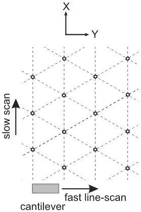 How clear is the structure of an atomic lattice being imaged depends sufficiently on the scan direction. Fig. 4 shows schematically the probe trajectory when scanning along (a) and across (b) atoms chain. As follows from the model, the sticking occurs at lattice points and the probe "slithers" down into these potential minimums (see above "Two-dimensional model").