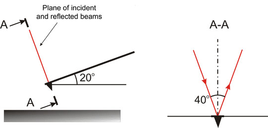 In the early model of the microscope Solver P47 the cantilever axis is inclined 20° to the sample plane (Fig. 1). The plane of incident and reflected beams is perpendicular to the cantilever axis. The angle between these beams is 40°. The beam reflected off the non-deflected cantilever is perpendicular to the photodiode plane.