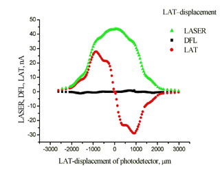 Experimental plots of the DFL and LAT signals vs. adjusting screws travel x and h are shown in Fig. 2.