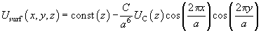 in the formula is responsible for the pseudoatomic resolution of scanning microscopy. Evidently, due to the exponential factor, the noticeable contribution into the interaction can give only neighbor atomic chains. As an example, consider [100] plane of a cubic lattice. The accurate calculation of the contribution of underlying layers into the potential for such a surface do not exceed 0.1%, therefore we shall restrict ourselves to considering only the top layer. Let
